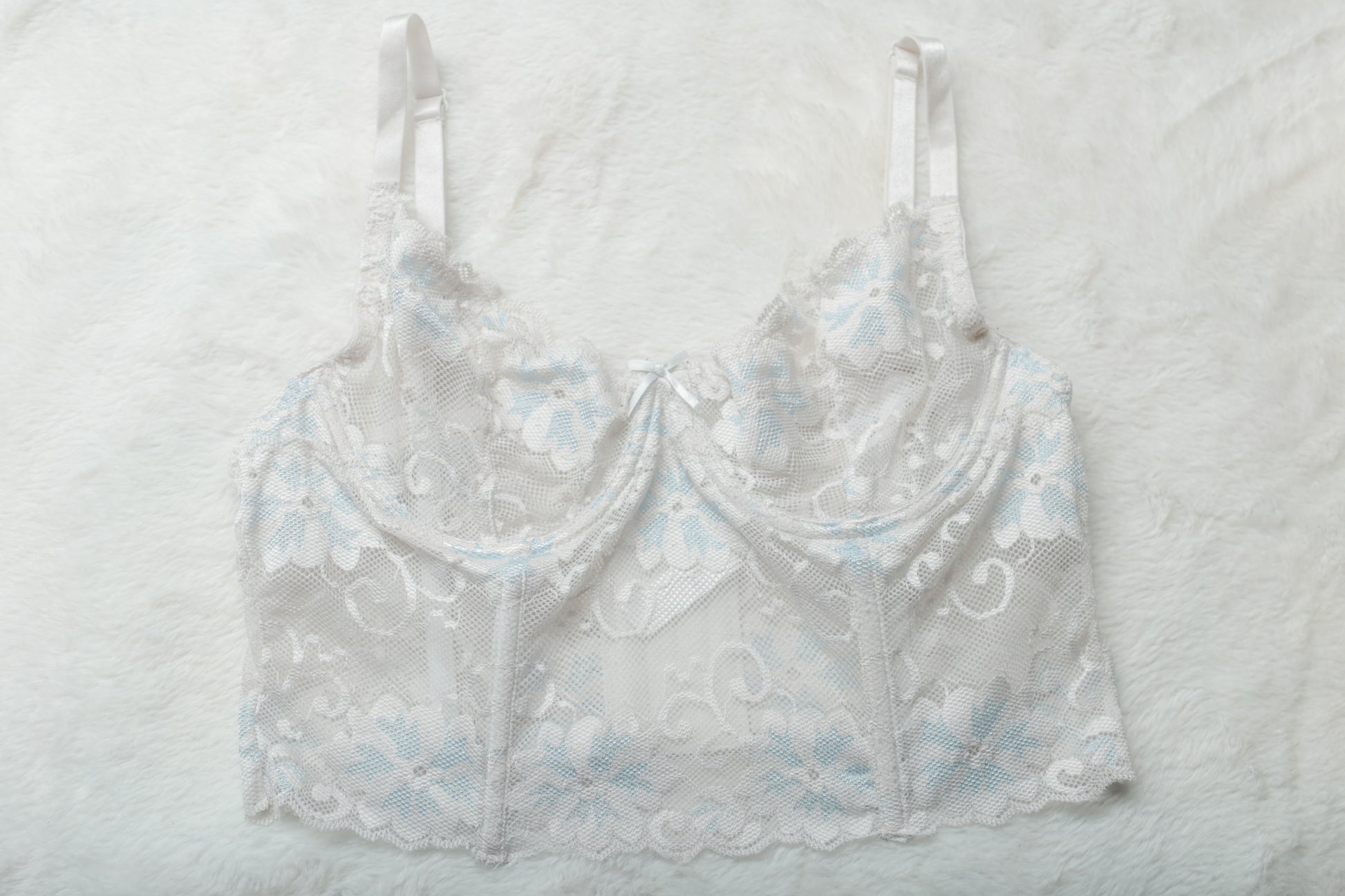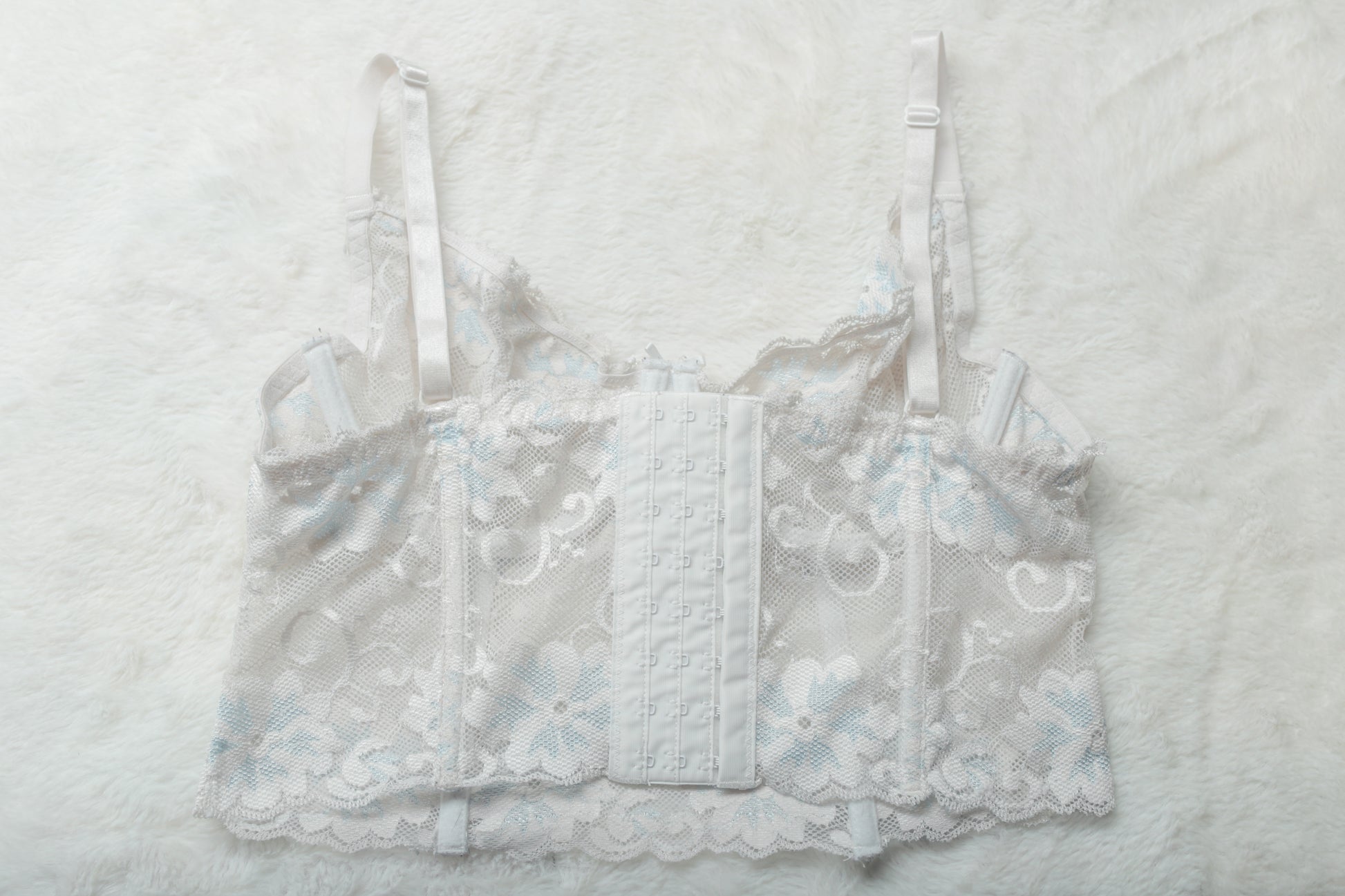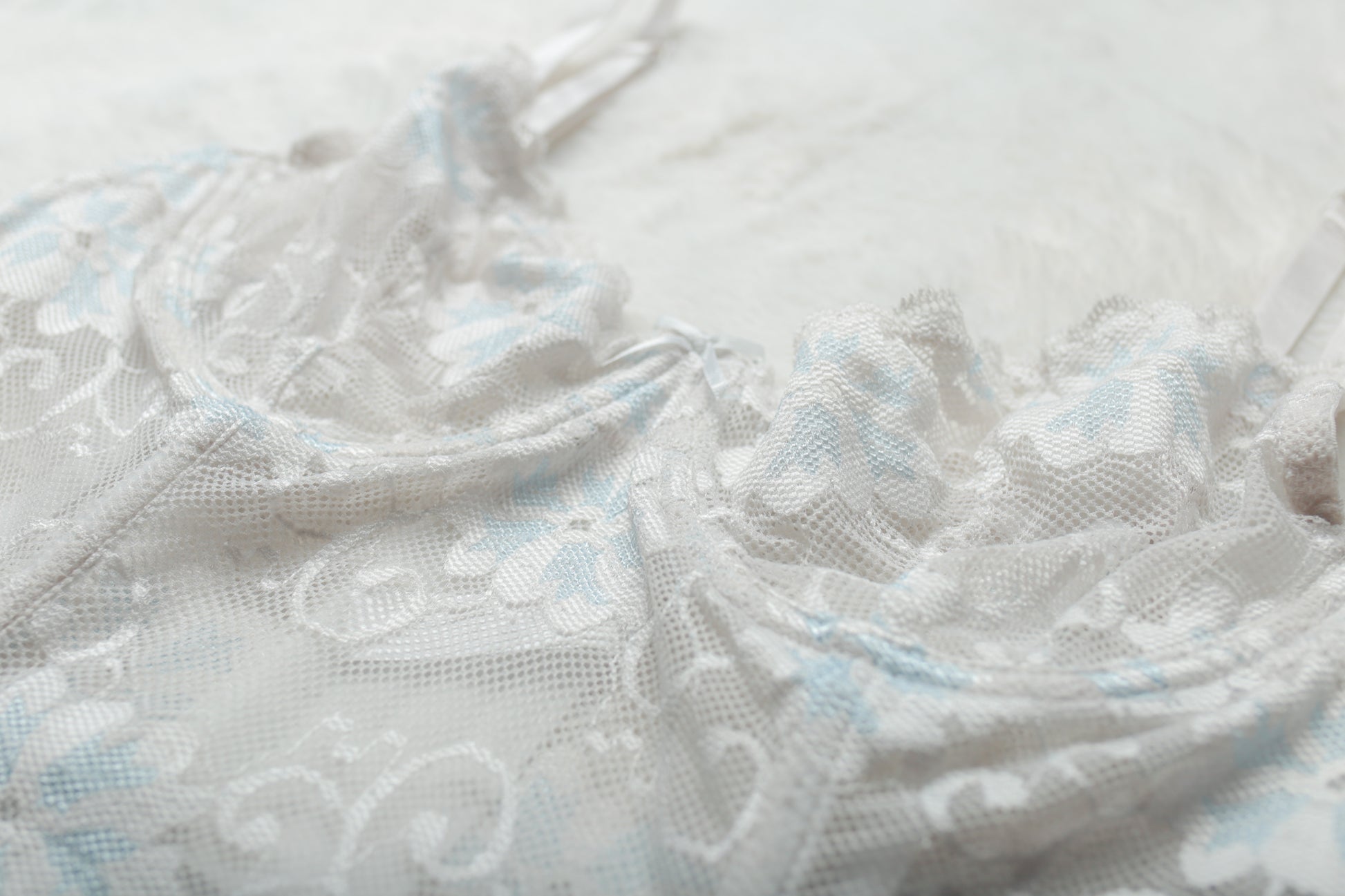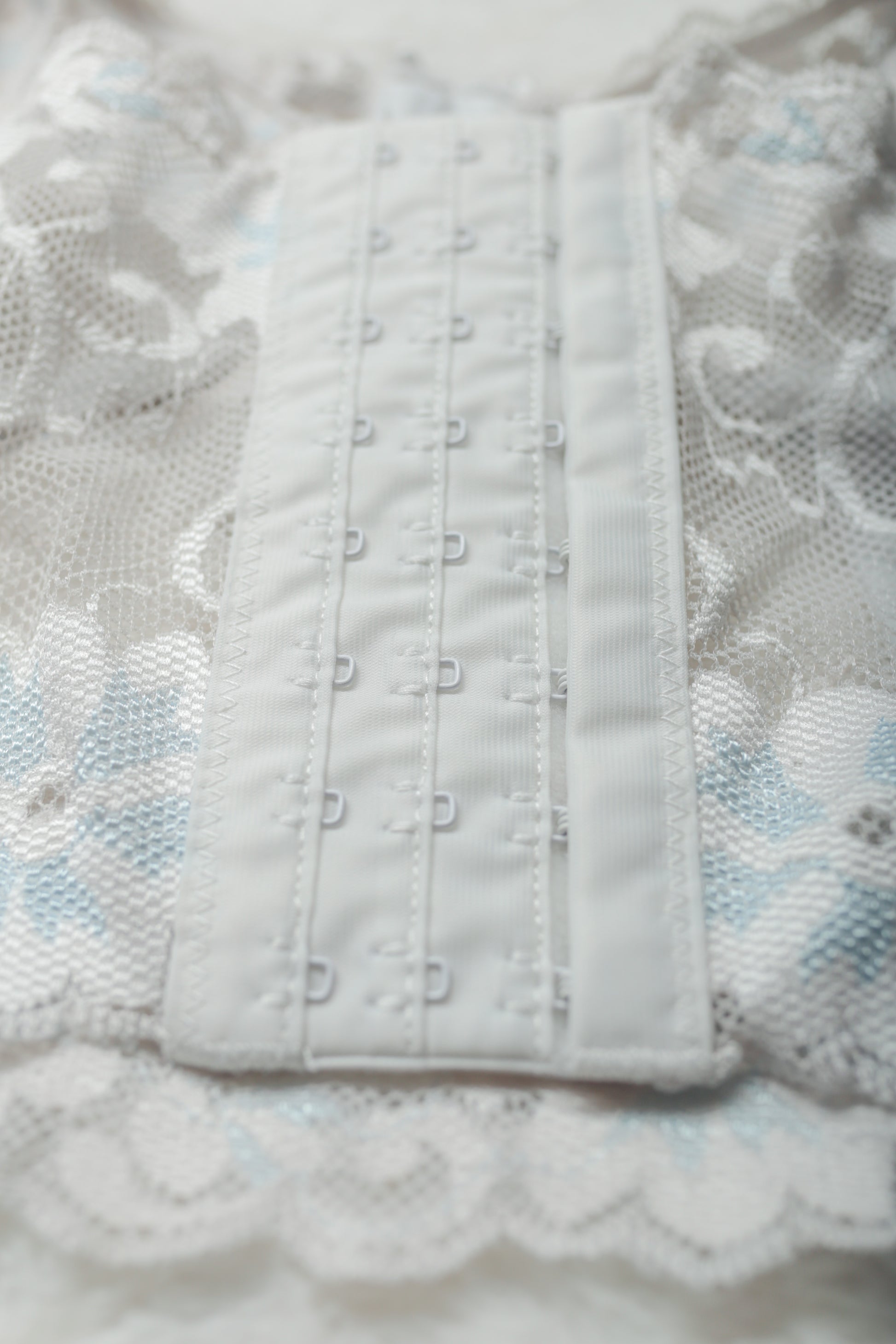 - White lace with blue floral accents