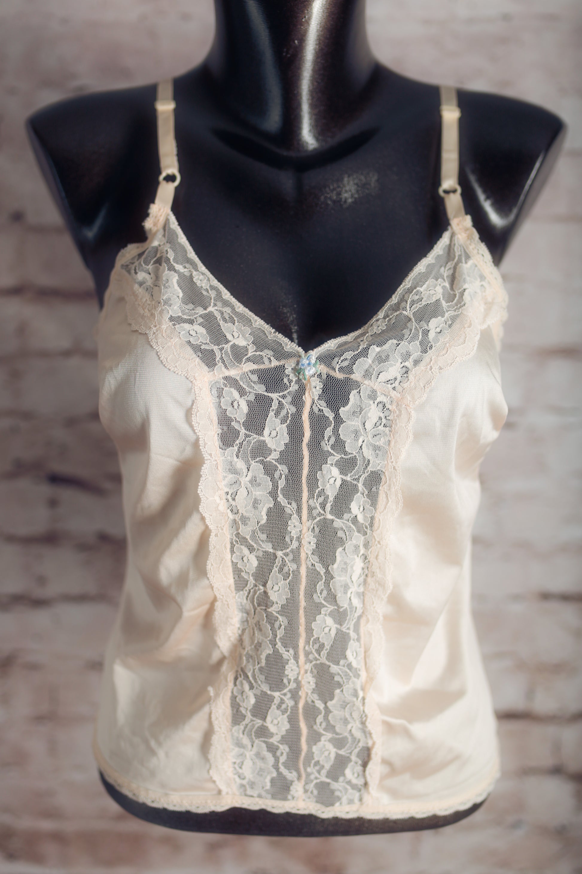 Vintage Pink Satin and Sheer Lace Camisole Chemise Small